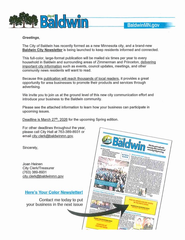 The City of Baldwin has maintained its rural identity with new growth in recent years. With this growth expected to continue, we welcome a diverse and vital population providing expanding business and job opportunities.