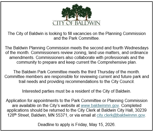 City of Baldwin is looking to fill vacancies on the Planning Commission and Park Committee.